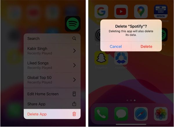 Schritt 1. Entfernen Sie die Spotify-App von Ihrem iPhone, indem Sie sie antippen und auf die Schaltfläche "App löschen" > "Löschen" klicken. Bitte vergewissern Sie sich, dass Sie die App vollständig deinstalliert haben.